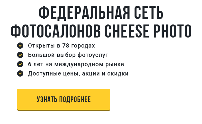 Фотосалон Cheese Photo является федеральной сетью фотосалонов, у нас большой опыт в работе, быстрая скорость обработки заказов и высокое качество услуг и товаров. Мы предлагаем разнообразный набор фотоуслуг: печать фотографий; печать ваших фотографий и изображений на различной сувенирной продукции; фото на документы; реставряцию фотографий и др.